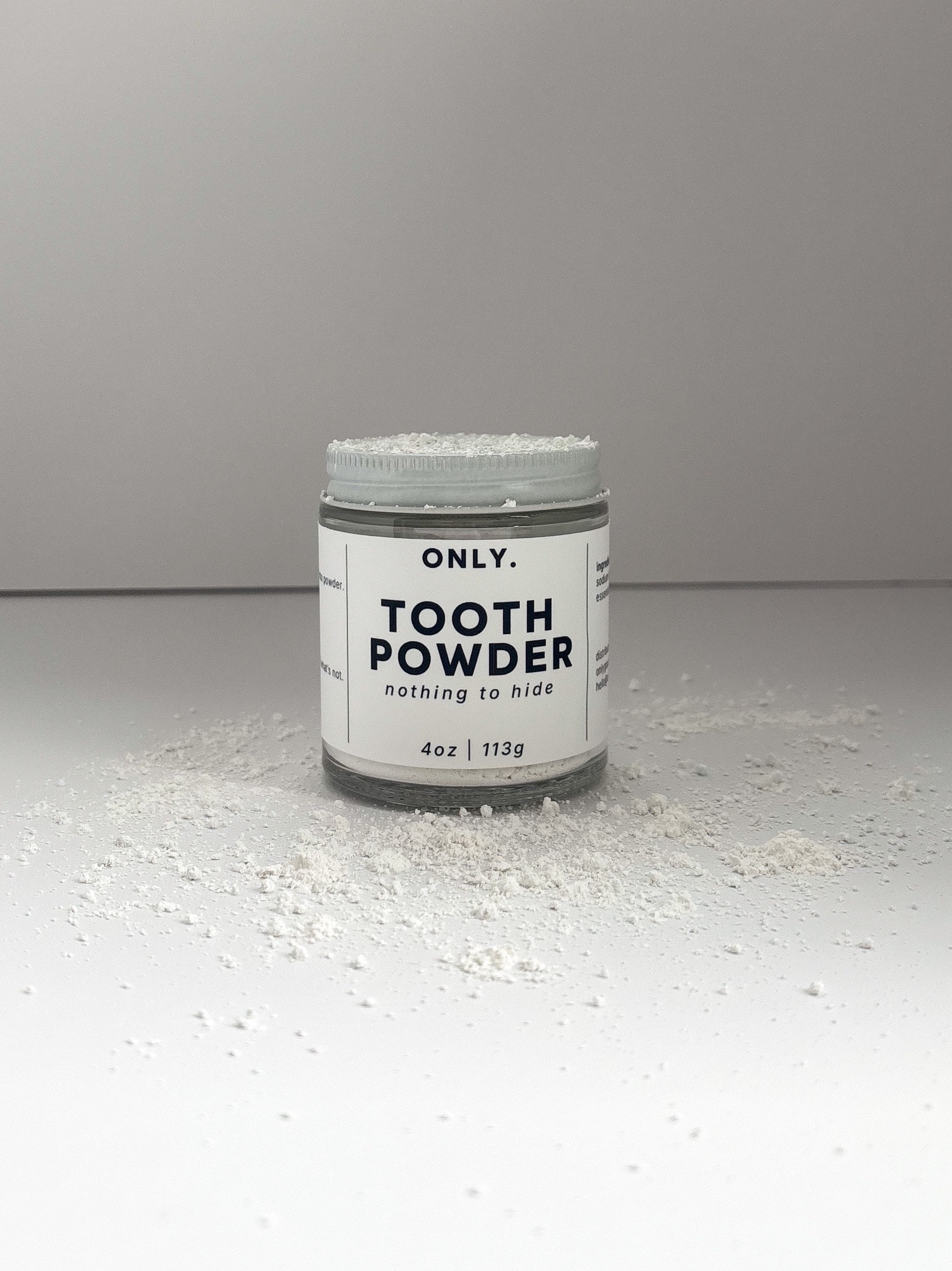 Flouride-free tooth powder. Five ingredients. One glass jar. Nothing to hide.